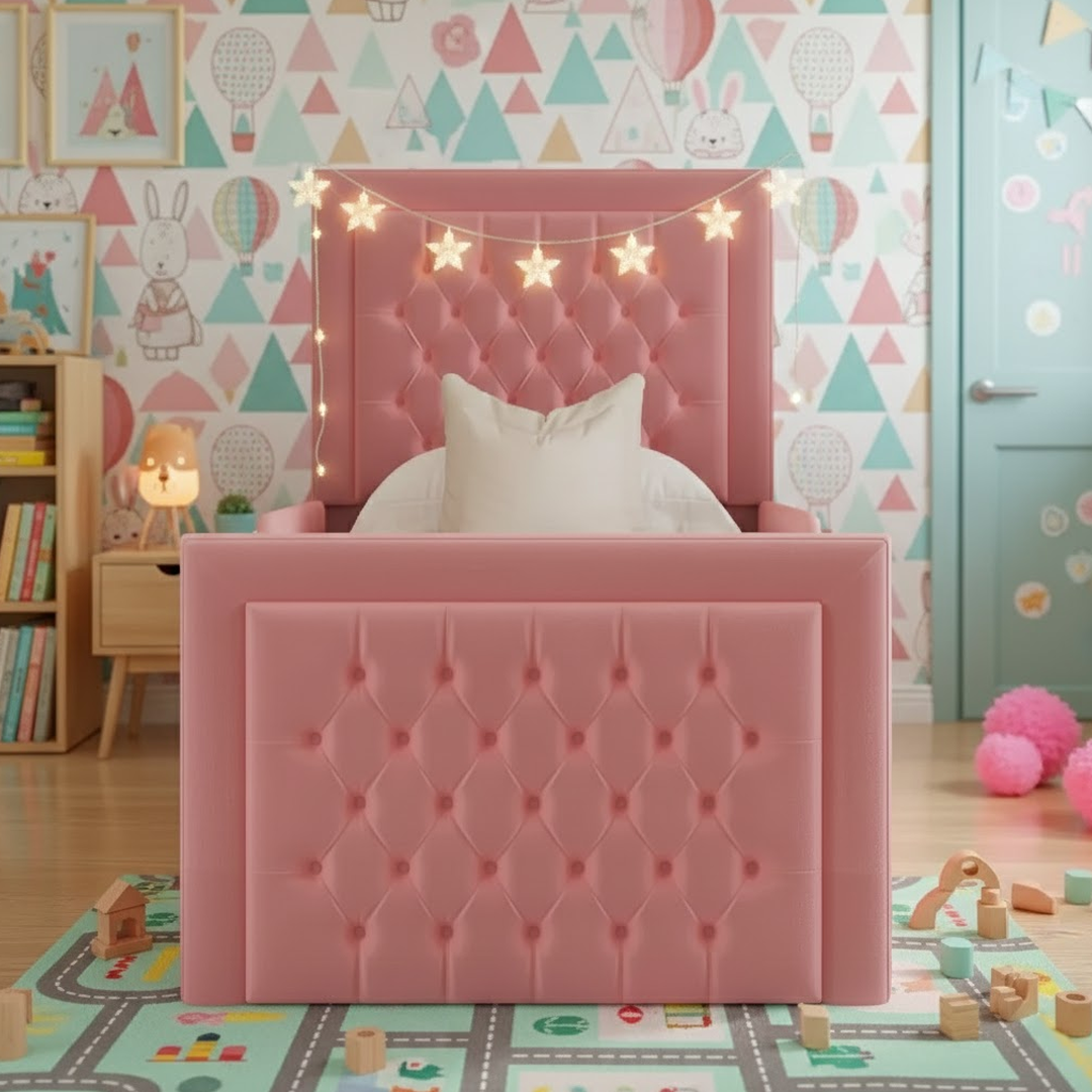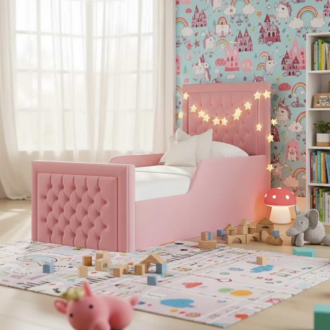The Dream Haven Kids Bed creates a calm, cosy and secure sleep space designed especially for children. Featuring a softly upholstered frame with gentle padding and low side rails, this bed offers comfort, stability and peace of mind. Its elegant, child-friendly design blends beautifully into any modern bedroom