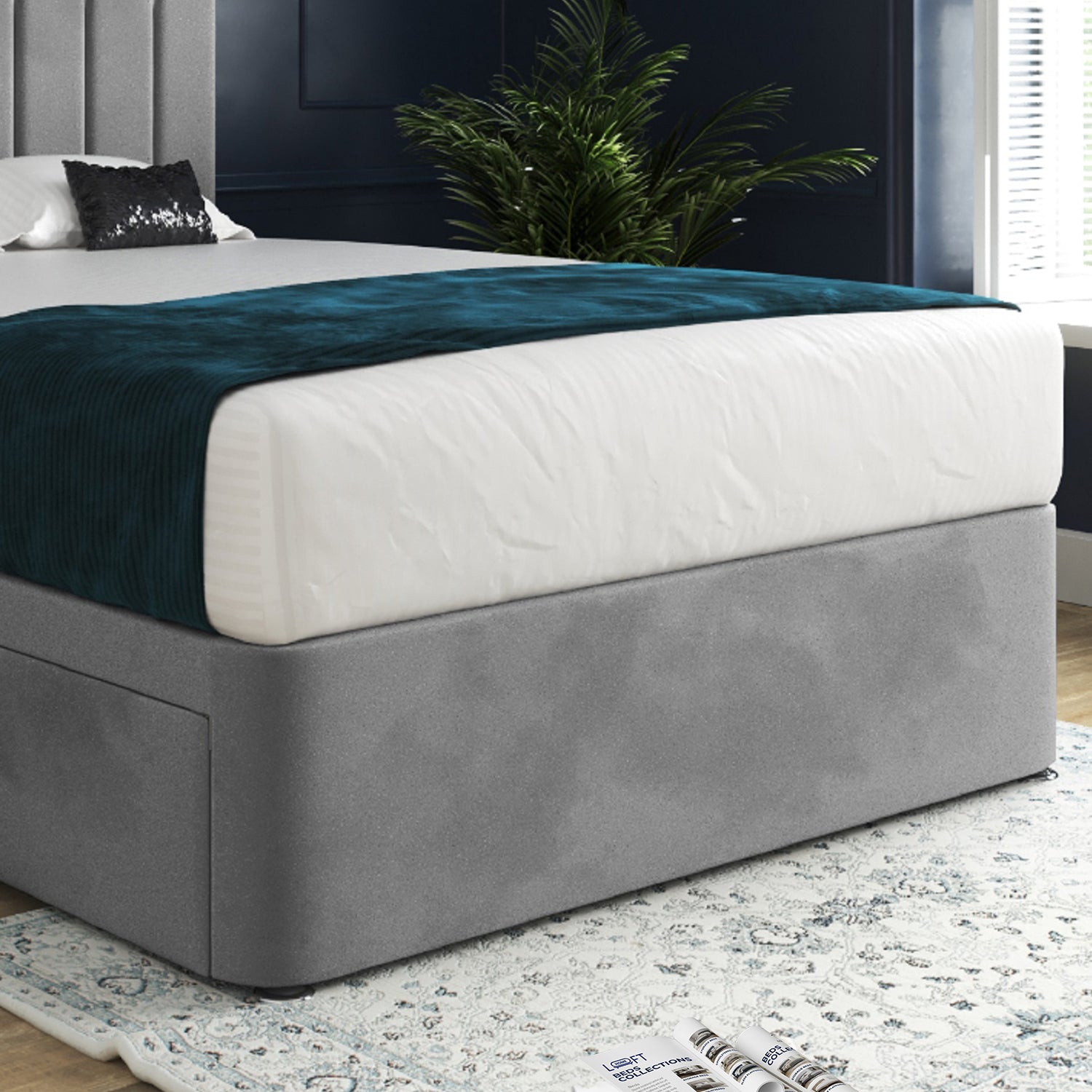 Linear modern design floorstanding headboard with a classic divan base. Divan base comes equipped with chrome gliders and optional drawer configurations can be chosen for added storage solution. The floorstanding headboard is solid and easy to affix to the base. Aesthetically clean and sleak with a contemporary line design.
