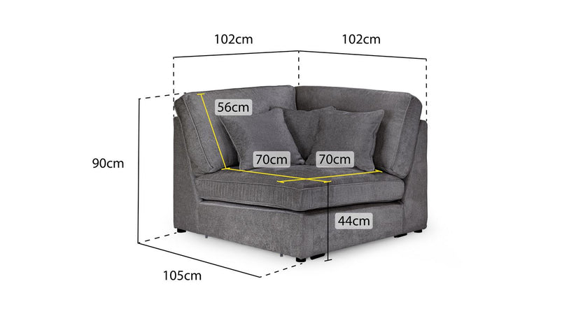 Introducing the Grey Kiana Modular Corner Sofa: cosy, comfy and crafted to last. Module: Grey, Corner The Kiana’s modular sofa structure offers absolute design freedom. Fancy changing things up a bit? Manoeuvre the layout of the modules to craft the perfect sofa for your lifestyle, allowing you to recreate your space at a whim and without hassle. Durability doesn’t have to mean compromise on comfort, especially not with the Kiana. Soft-touch chenille upholstery presents the best of both worlds; the tightly woven yarn is strong enough to withstand the trials and tribulations of day-to-day life- but still retains a soft, cloud-like disposition to relax on. The Kiana comes adorned with cosy cushions. Non-slip panels back the Kiana’s (removable) cushions covers to keep your sofa looking immaculate, while extra comfort cushions are scattered across each module - absolute bliss.
