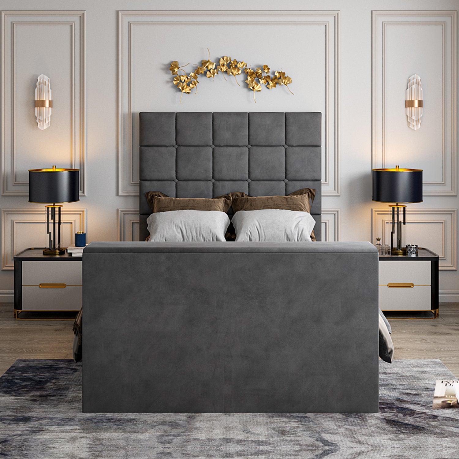 Squared Headboard Design: A modern geometric segmented design not only offers visual intrigue but is meticulously stitched to perfection, serving as a plush and comfortable backrest.