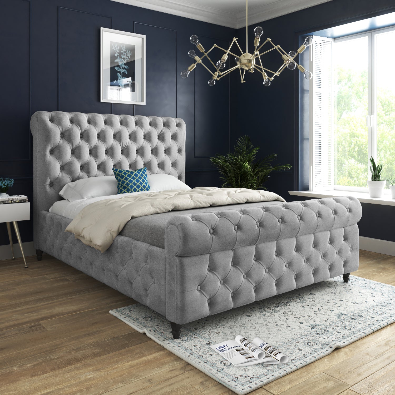 Inspired by the iconic chesterfield style, this luxurious bed frame features elegant scrolled head and footboard, complete with pleated upholstery and choice of buttoning. The siderails are also upholstered with pleats and buttoning. It features a beautiful sleigh style design and is finished in selection of beautiful fabrics. A slatted base offers supreme mattress support and ventilation. Choice of legs to choose from :- dark wooden feet or silver ornate feet giving the perfect finishing touch.