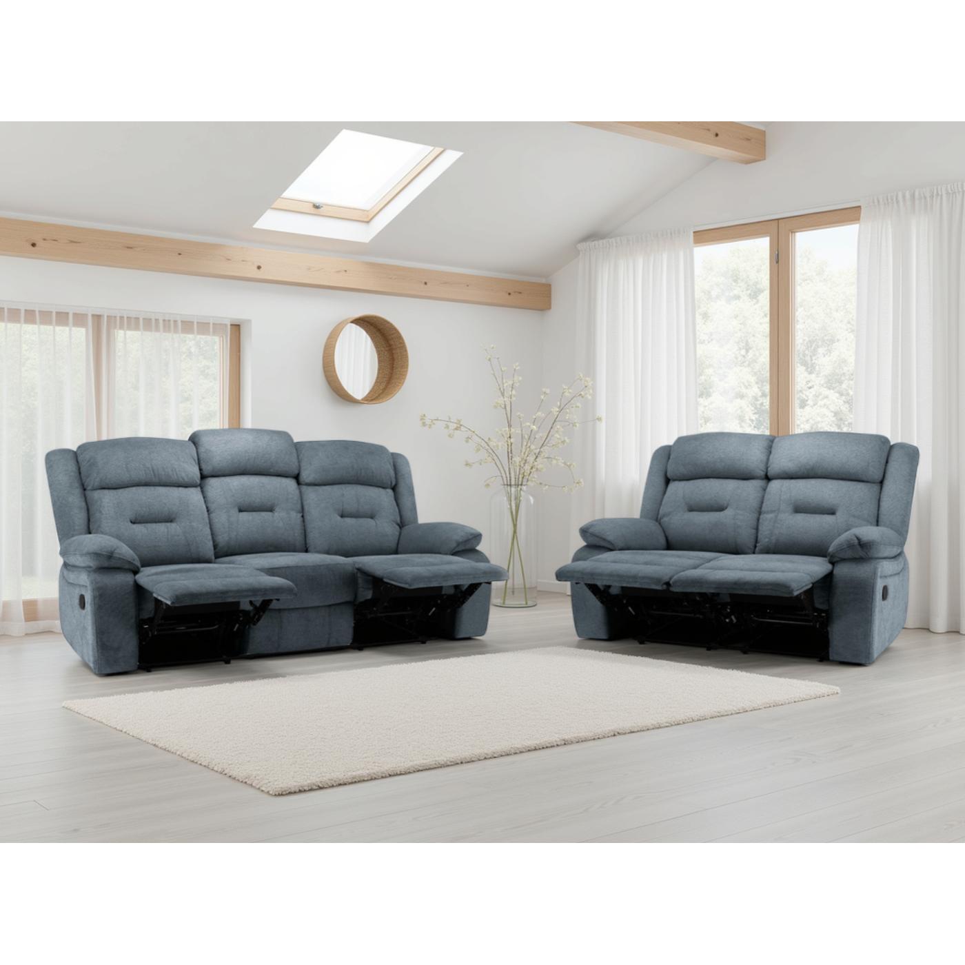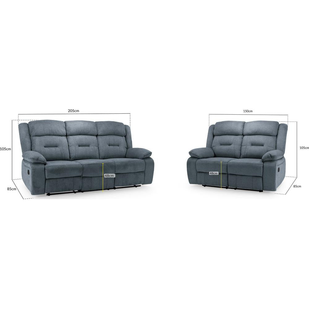 The Novie range comes in two fantastic colours, Black faux leather, grey faux fabric and is available as a 3+2 Seater. Features padded arms and backs and a smooth manual reclining mechanism.